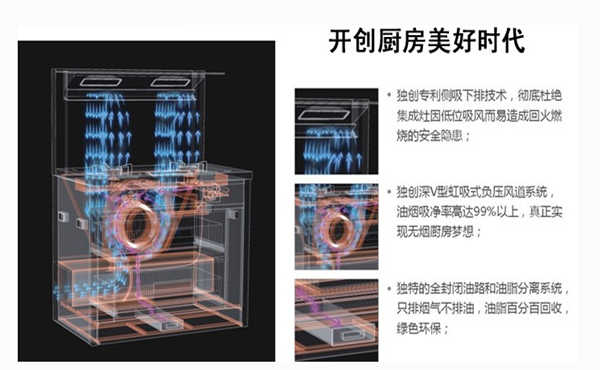 集成灶的“V型”集烟腔设计,创造性的采用外八字喇叭口设计,强劲下排吸力,无论是废油还是烟都无所遁形。更是研发V型油路,油烟高效分离,独创的双管齐下技术,分离后的废油向下流到大容量集油盒,干干净净,清洁方便。相比于传统的抽油烟机来说,油烟分离效果要好很多,集成灶为厨房的绿色、洁净做了很好的保证。